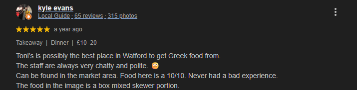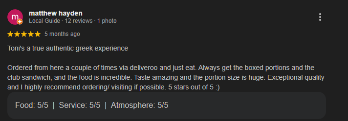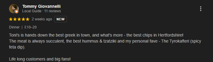 We’re incredibly proud to be the area’s favorite Greek takeaway, and we never take that support for granted. Whether you’re ordering in or stopping by, you’re not just a customer, you’re part of the Toni’s family.